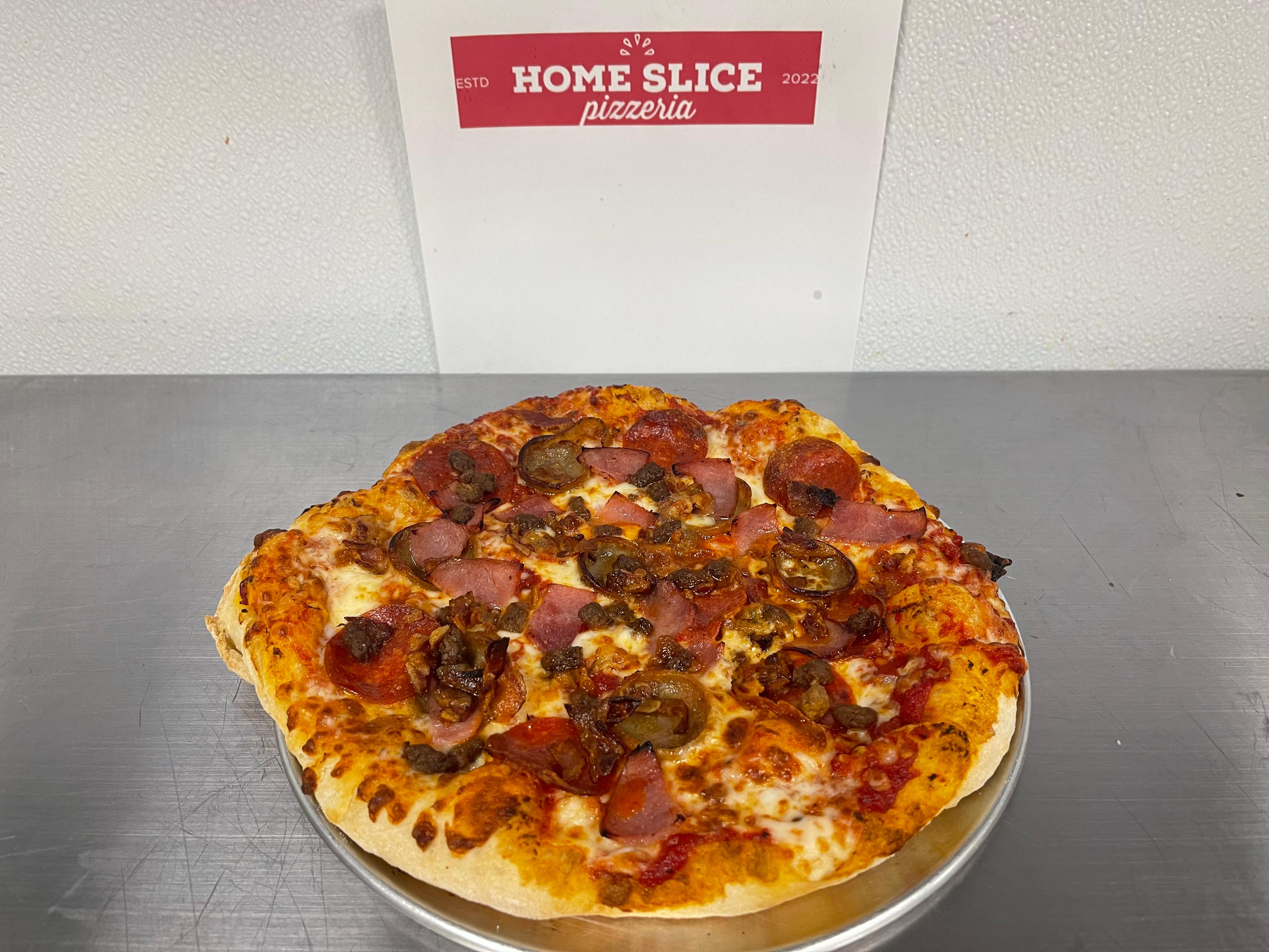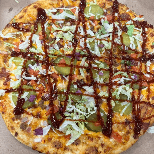 Home Slice Mayo Sauce, Cheddar, mozzarella, bacon, pickles, lettuce, bbq sauce, onion. One of our best pizzas